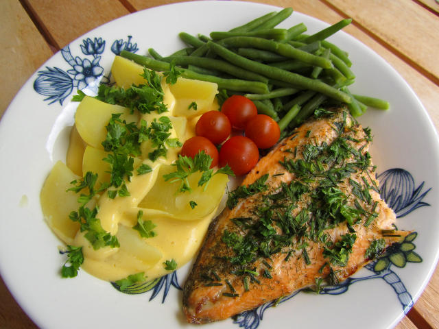 Ranskalaisuus näytti tosiaan inspiroineen Albertoa pääruuankin osalta – lohen kanssa oli nimittäin tarjolla hollandaisekastiketta.